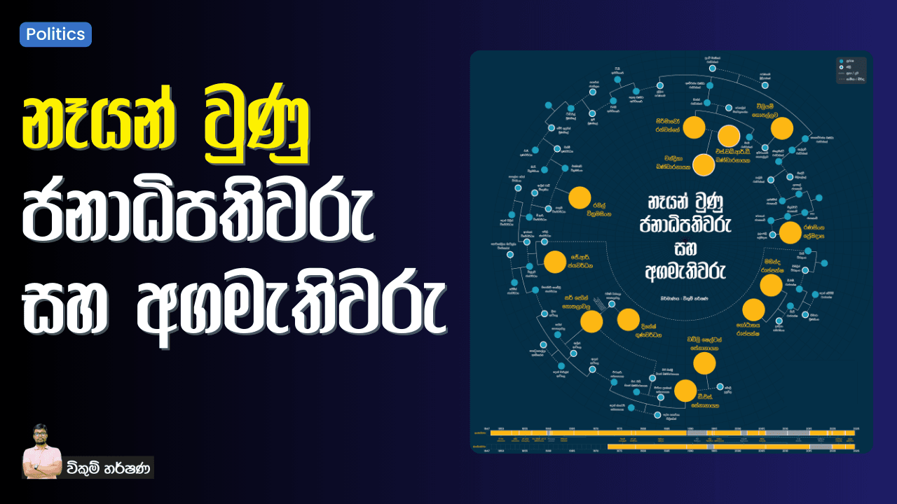 🔅 ශ්රී ලංකාවේ ජනාධිපතිවරුන් 9 දෙනෙක් සහ අගමැතිවරුන් 15 දෙනෙක් පත් වෙලා තියෙනවා. 🔅 ඔවුන්ගෙන් ජනාධිපතිවරුන් 6 දෙනෙක් සහ අගමැතිවරුන් 11 දෙනෙක් එකිනෙකාට ළඟින් සහ දුරින් නෑයෝ වෙනවා. 🔅 එම නෑදෑකම් සියල්ලම ඒ ඒ පවුල්වල විවිධ පරම්පරාවල සිදු වූ විවාහවලින් ඇති වී තිබෙනවා. 🔅 වසර 52 මාස 3 ක ජනාධිපති ඉතිහාසයේ වසර 46 මාස 5…