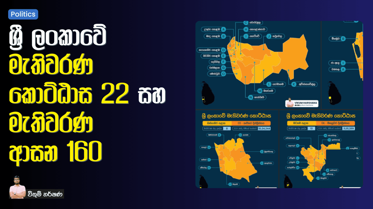 🔅 ශ්රී ලංකාවේ මැතිවරණ කොට්ඨාස 22 ක් තියෙනවා. 🔅 ශ්රී ලංකාවේ පරිපාලන දිස්ත්රික්ක 20 ක් “මැතිවරණ කොට්ඨාස” වශයෙන් සැලකුණත්, යාපනය සහ කිලිනොච්චි පරිපාලන දිස්ත්රික්ක දෙක “යාපනය මැතිවරණ කොට්ඨාසය” ලෙසත්, මන්නාරම, මුලතිව් සහ වව්නියාව පරිපාලන දිස්ත්රික්ක තුන “වන්නි මැතිවරණ කොට්ඨාසය” ලෙසත්,හඳුනාගන්න පුළුවන්. 🔅 මේ මැතිවරණ කොට්ඨාස 22 තුළ මැතිවරණ බල ප්රදේශ (මැතිවරණ ආසන) 160 ක් ඇතුළත්…